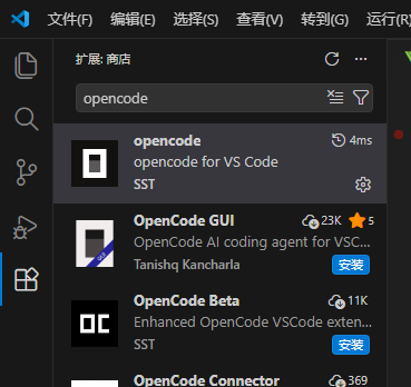 VS Code中的插件只是UI界面,要先安装OpenCode本体才行。