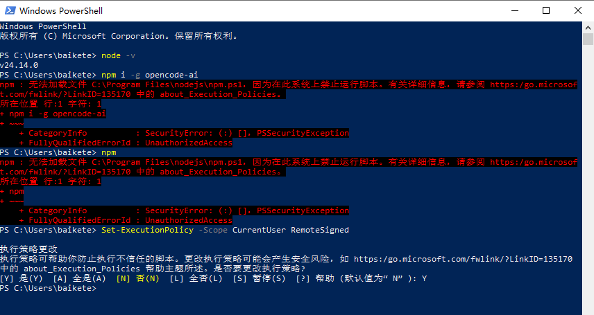 npm install -g opencode-ai Ps:如果有报错 PS C:\Users\baikete> npm i -g opencode-ai npm : 无法加载文件 C:\Program Files\nodejs\npm.ps1,因为在此系统上禁止运行脚本。有关详细信息,请参阅 https:/go.microsof t.com/fwlink/?LinkID=135170 中的 about_Execution_Policies。 所在位置 行:1 字符: 1 + npm i -g opencode-ai + ~~~ + CategoryInfo : SecurityError: (:) [],PSSecurityException + FullyQualifiedErrorId : UnauthorizedAccess 解决: